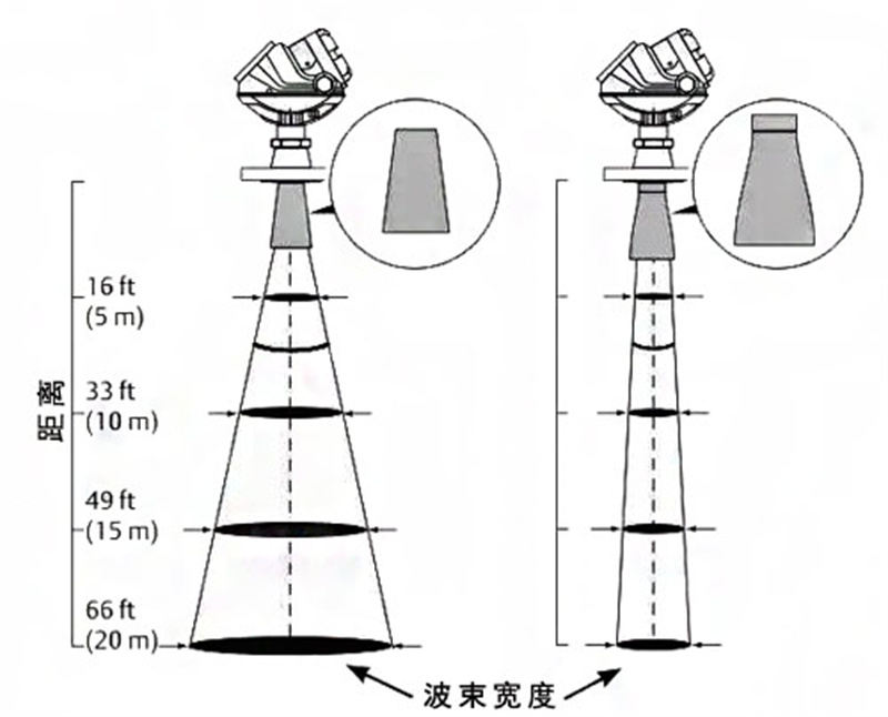 雷達液位計的總波束寬度與設備的頻率成反比。因此對于同一直徑的天線,如果雷達液位計的頻率提高,波束寬度將低于較低頻率的設備,狹窄的波束可將管嘴、罐壁和干擾物的影響降至ZUI低。如下圖所示(左側是6 GHZ的,右側為26GHZ的)。