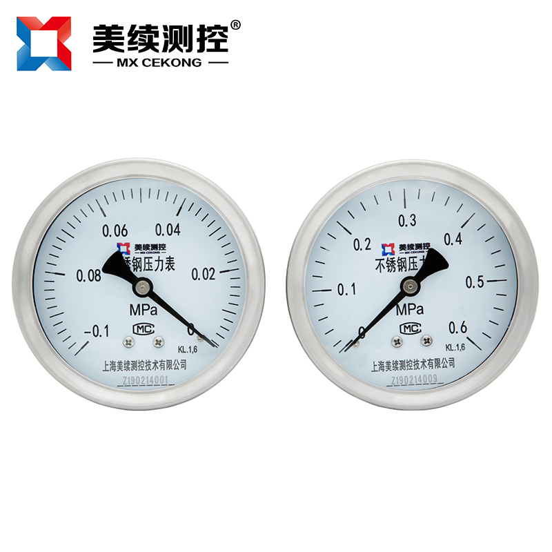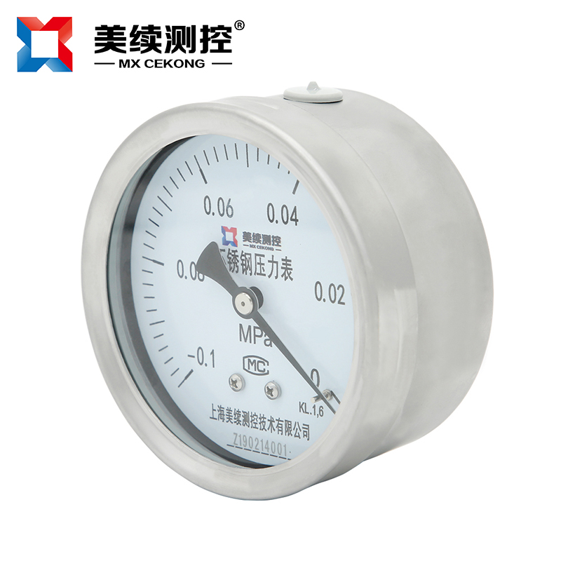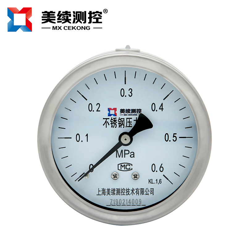 工業用壓力表MX-YB-02系列不銹鋼耐震壓力表,不銹鋼壓力表廣泛用于石油、化工、化纖、冶金、電站等工業部中對液體、氣體的簡易監測和測量,以便工人,企業能夠有效地對所需要監測的自動化設備實施有效的控制,其特點就是方便快捷和成本低,對安裝工人的安裝經驗要求不高。如果想要進行更為高精度額測量請使用上海美續測控MX-YL-系列變送器。如果使用環境中有震動等壞境因素,可以使用本系列的不銹鋼耐震耐壓力表,其在指針界面灌裝抗震油可以有效地減少震動對儀表的損害。