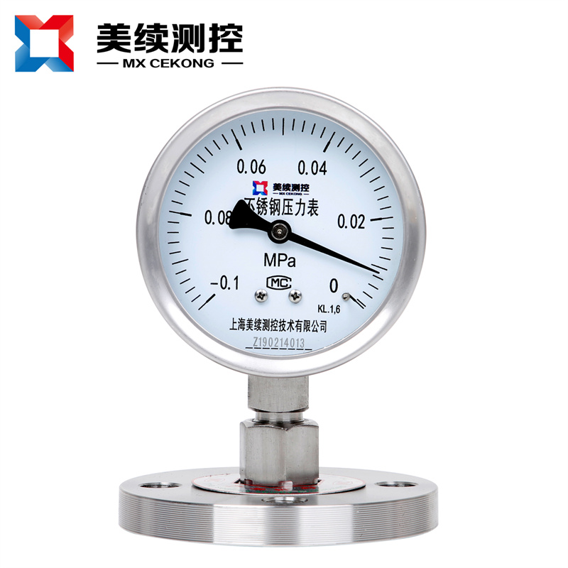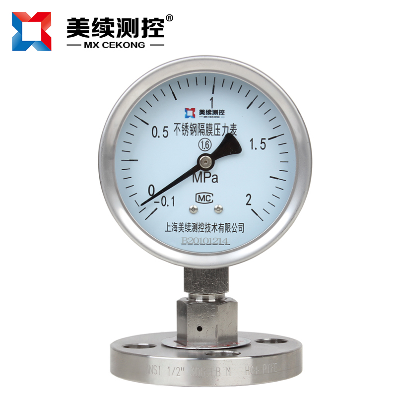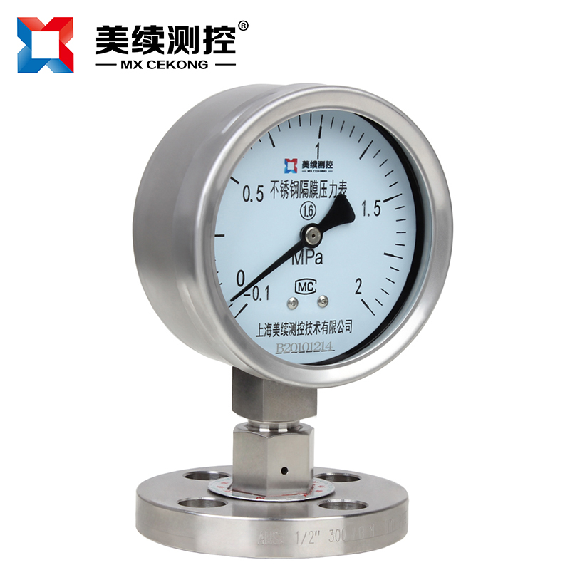 隔膜壓力表MX-YB-03隔膜式壓力表采用法蘭標準件組合擰緊密封。高彈性合金波紋膜片、原裝進口機芯,全不銹鋼結構設計,能適應各行各業的腐蝕性介質的壓力測量。表殼任意360度調整最佳可視角度。