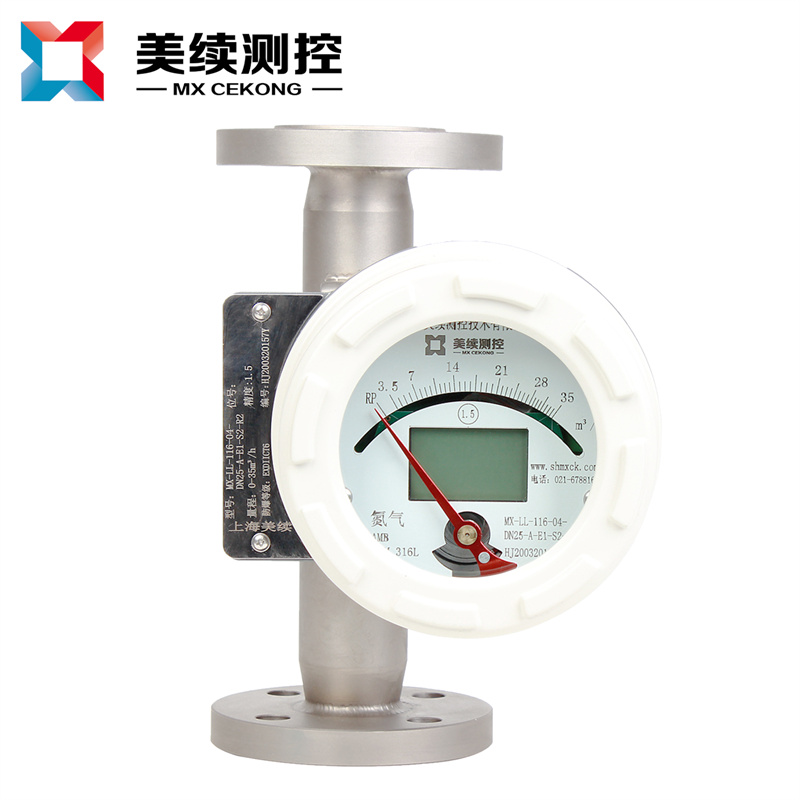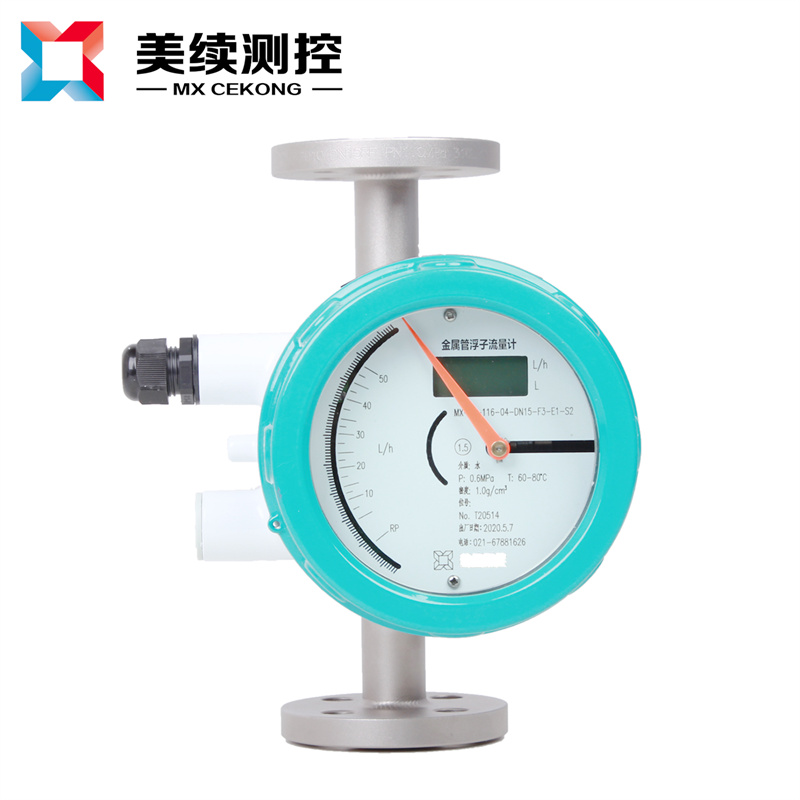 上海美續(xù)金屬轉(zhuǎn)子流量計MX-LL-116-04系列-金屬管浮子流量計主要由兩大部分組成:傳感器和指示 器。傳感器主要由連接法蘭、測量錐管、浮子和上下導向器組成;指示器主要由殼體、磁傳動系統(tǒng)、刻度盤和電遠傳系統(tǒng)組成。在垂直的錐形測量管內(nèi),有一可上下移動的測量部件——浮子,當流體自下而上通過錐形管時,浮子受到流體的作用力,沿錐形管向上移動。當流體的流量增大時,浮子的位移量增大;反之,流體的流量減少時,浮子的位移量變小。也就是說,流體流量的大小,決定了浮子在測量管中的位置,從而決定了浮子和錐形管之間環(huán)形面積的大小。當流體的流量保持在一個恒定的流量 Q 時,浮子也處于一動平衡狀態(tài),停留在錐形管中的一位置 h,此時,浮子和錐形管之間的 環(huán)形面積保持恒定。浮子受到三個力的作用:浮子的重力 G,浮子受到的浮力 F,浮子受到流體的作用力 P,這三個力達到平衡。根據(jù)流體動力學的柏努力方程、力平衡原理和流體連續(xù)性定律,可以計算出此時通過環(huán)形面積的瞬時流體流量,所以金屬管浮子流量計是用可變面積測量流量的原理。在浮子的內(nèi)部,鑲嵌一高性能永久磁體,當浮子處于平衡位置時,在浮子周圍形成一均勻而穩(wěn)定的磁場。在錐形管的外面,安裝一磁傳感器,這樣就能將測量管內(nèi)浮子的直線位移通過非接觸形式傳遞到指示器中,通過檢測和處理后,最終顯示在指示器刻度盤上或輸出相應的標準 4 ~ 20mA 電流信號。