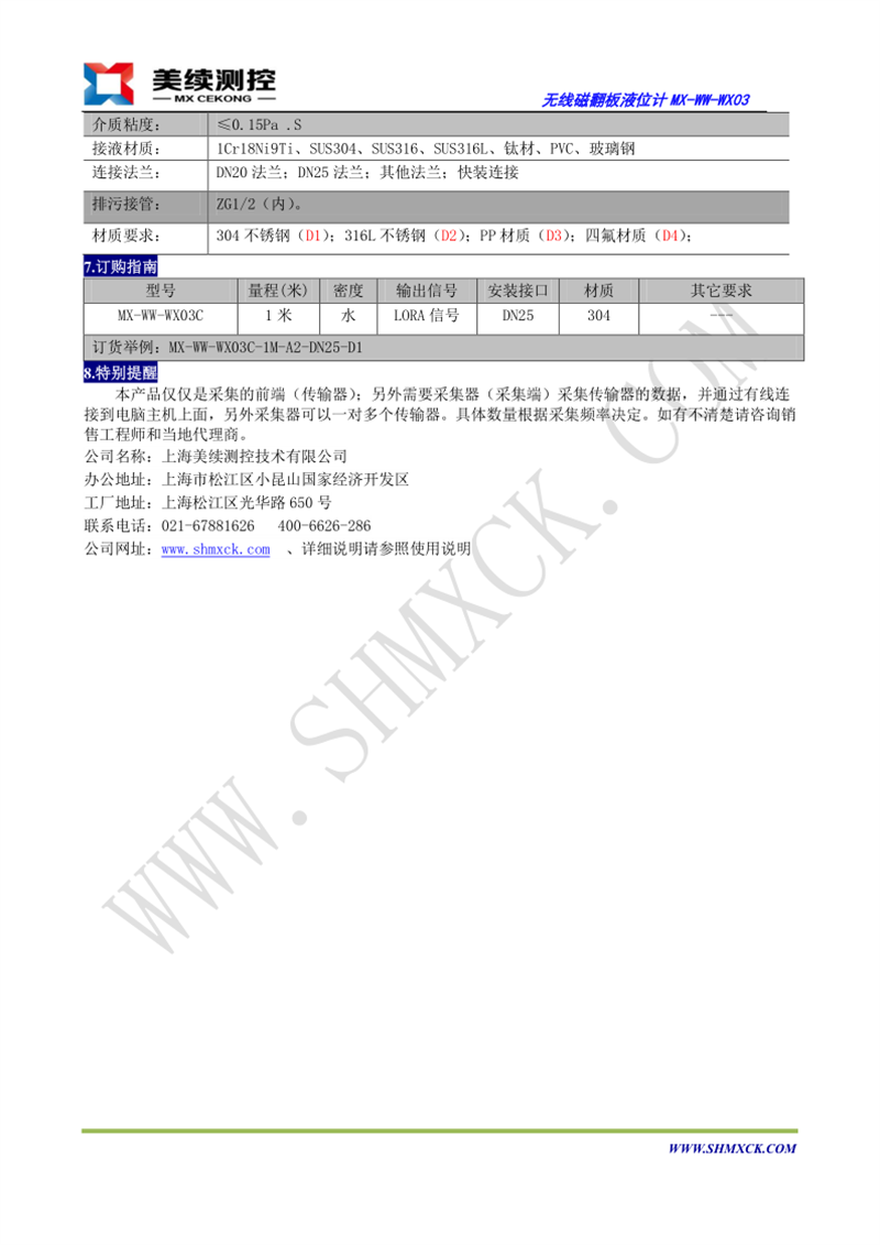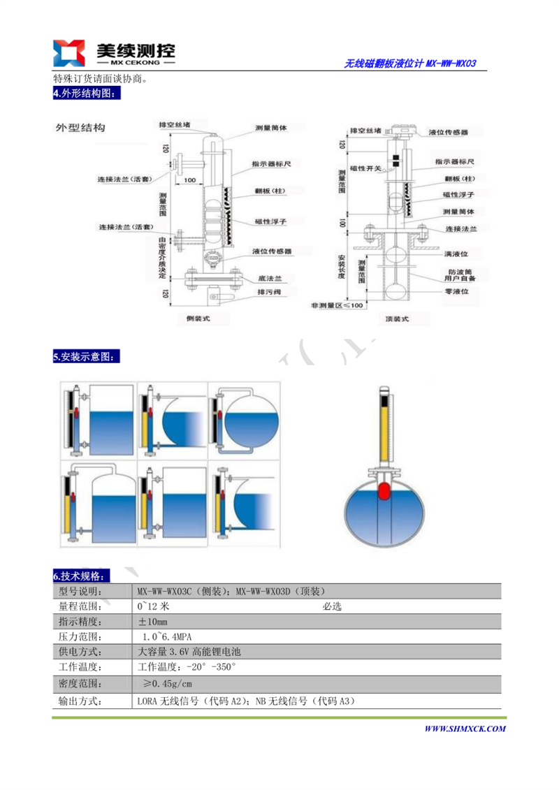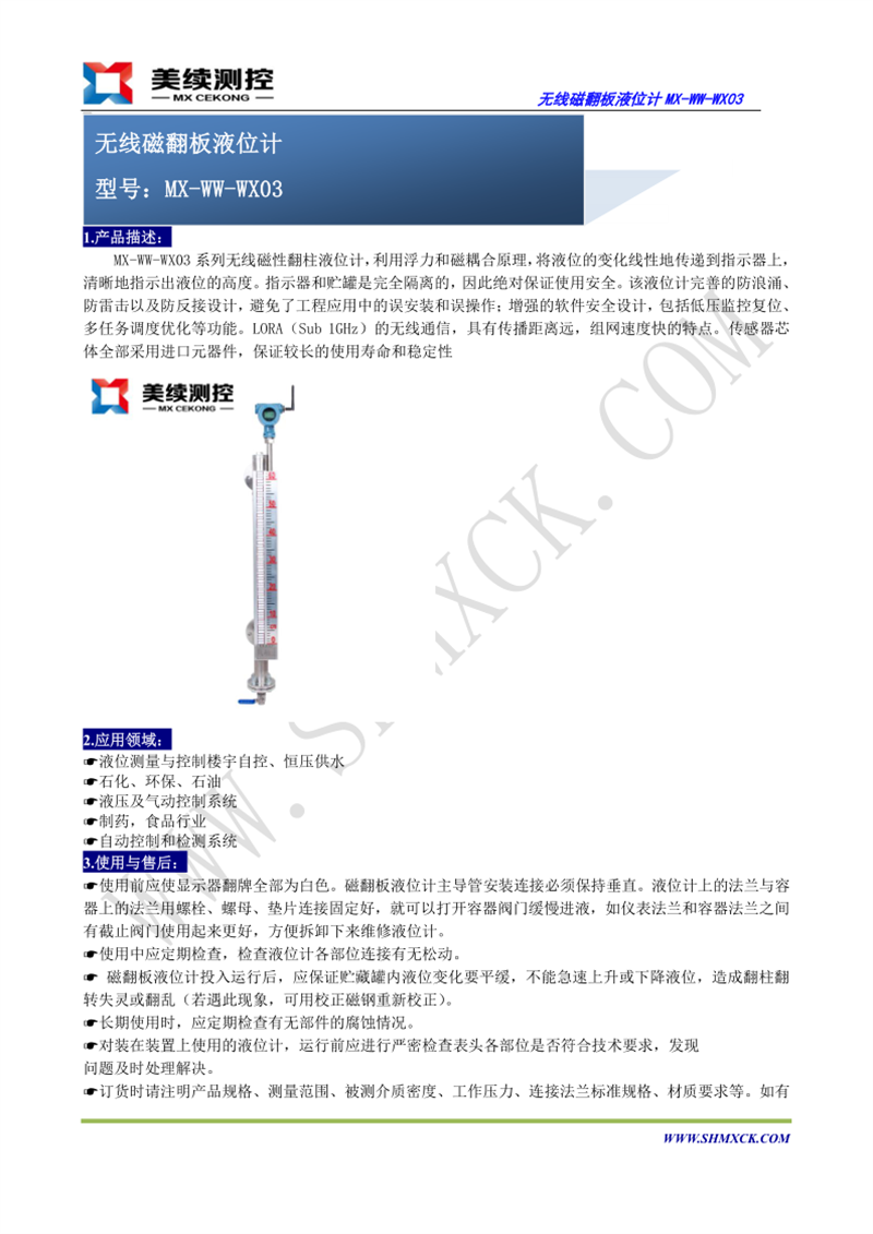 MX-WW-WX03系列無線磁性翻柱液位計,利用浮力和磁耦合原理,將液位的變化線性地傳遞到顯示器上,清晰地指示出液位的高速度。
