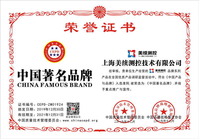 2019年的最后一天,上海美續測控技術有限公司被中國質量技術管理委員會和中國品牌戰略推進協會同時授予“中國著名品牌”榮譽稱號,成為同行業中誠信生產經營的典范。